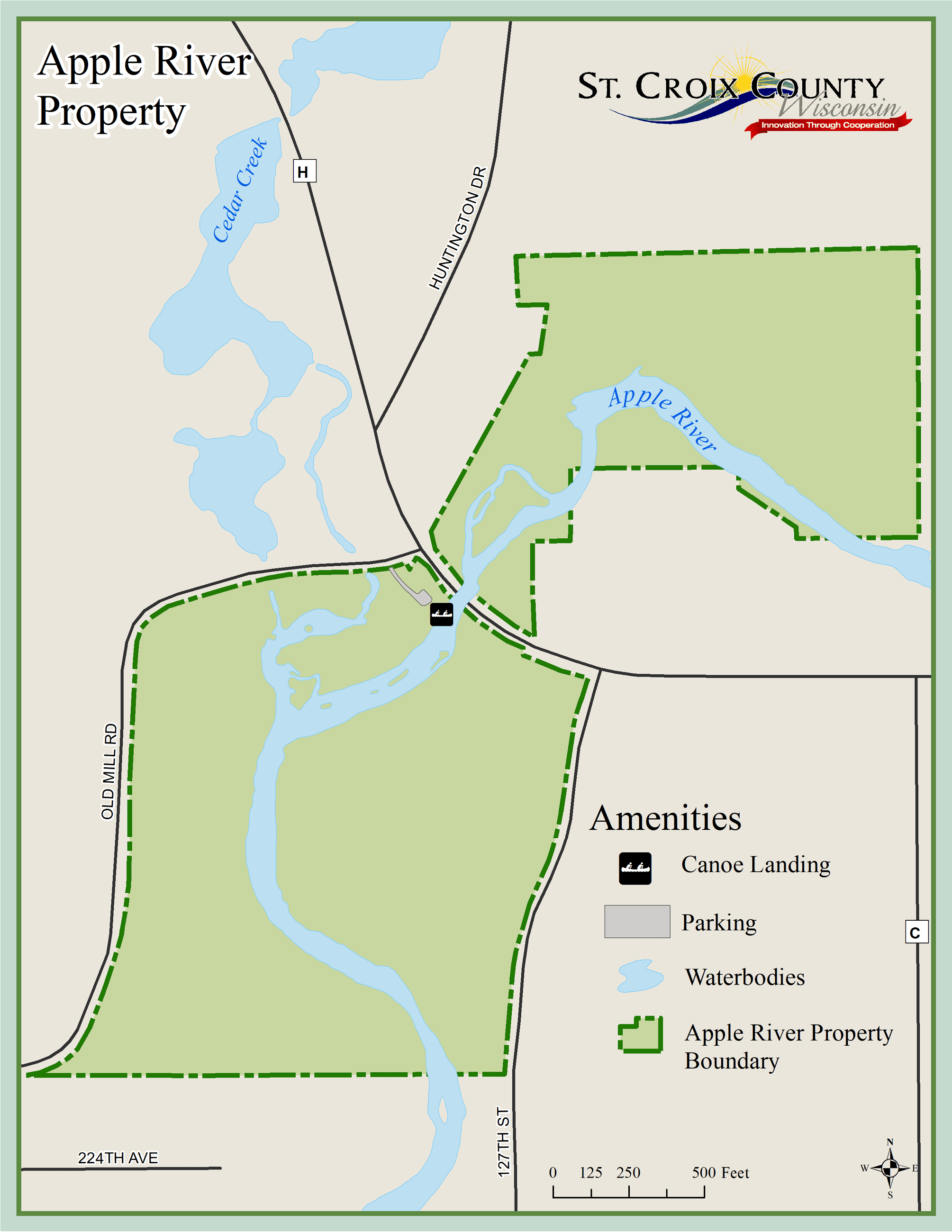St. Croix County owns approximately 59 acres of land on the Apple River in the Town of Star Prairie. The Northern States Power Company donated the land to the County in 1964. The land is divided by County Road H. The site is used by the neighboring property owners and some local hunters and fishermen.